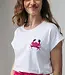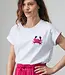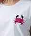 Een knipoog naar de zomer en vakantie. T-shirt Manon heeft een klassieke ronde hals en korte mouwen met boorden, maar verrast met een geborduurde krab op de borst, verfijnd afgewerkt met kraaltjes. Dat maakt dit item speels én bijzonder. De fit is comfortabel en makkelijk te stylen. Combineer het shirt met broek Rumi voor een casual look of met maxi-rok Emi in fuchsia voor een uitgesproken zomerse twist.