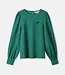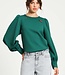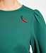 Strak design met een spicy detail. Deze groene top in stevige stof heeft een elegante ronde hals, subtiele pofmouwen en een chilipeper broche voor een verrassend accent.